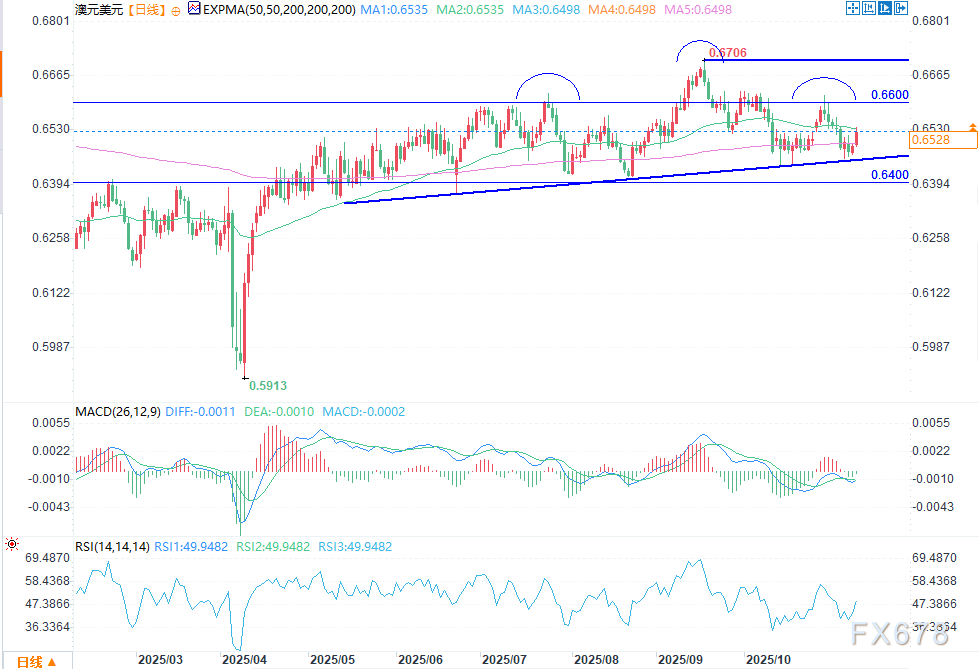EBC官网——周一(11月10日)欧盘时段,澳元/美元盘中报0.6528,涨幅0.52%。澳洲联储(RBA)维持利率不变后,澳元/美元汇率在关键支撑位附近维持窄幅波动。该货币对当前较今年迄今高点0.6700有所回落。