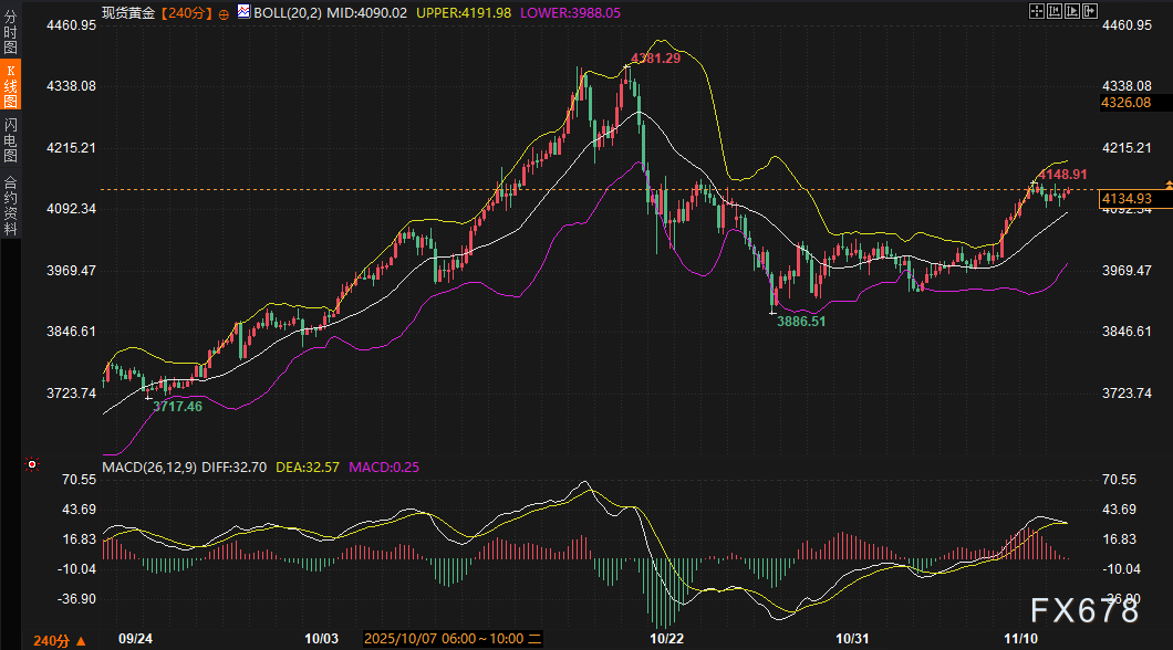 汇通财经APP讯——周三(11月12日),现货黄金价格在4130美元/盎司附近窄幅震荡,延续了三周高位附近的盘整格局。美元指数则小幅反弹,结束了此前五连跌的颓势,短暂收复部分失地。市场整体氛围趋于谨慎,交易员们将目光锁定在美国国会关键投票的进程上,这一事件或将为本周后半段的资金流动注入不确定性。与此同时,美联储内部对宽松政策的预期持续发酵,叠加劳动力市场软化信号,强化了贵金属的结构性支撑。短期内,美元的企稳与黄金的横盘共振,反映出投资者在财政与货币政策双重变量下的观望心态,预计未来2-3日走势将围绕这些核心驱动展开细微博弈。